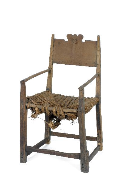 - Länstol, av bok, omålad. Rygg med tvärbricka, upptill kantfasonerad i form av krona, nedtill bak två fyrsidiga upptill avsmalnande ryggståndare. Två raka, något rundade armstöd på fyrsidiga stöd som fortsätta. Fyra raka liksidiga ben med ramslåer. Märkt, inskuret: NoMR / 1801