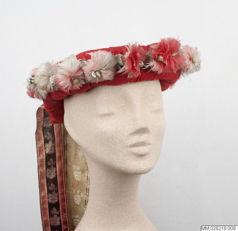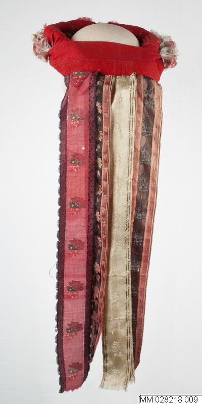 - Brudkrans, "kludalock", stomme virad med rött kläde, krans av fjäderblommor i rosa och grått. Fina blommiga sidenband, 2 lika i svart och rött, 2 i beige, 1 svart, rött, vitt och grönt.
