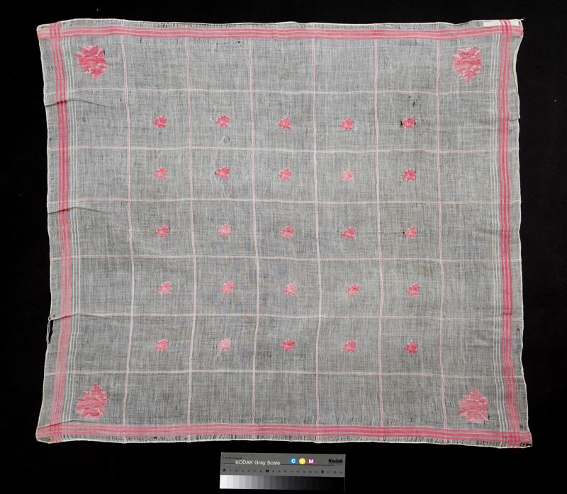 Huvudkläde av vit bomullsmoll, med ett glest,vävt rutmönster i rosa. I hörnen är en större blomma med blad inplockad i rosa bomullsgarn, i varje ruta finns också en liten inplockad blomsterkvist. Längs sjalens kanter löper tre bredare rosa ränder.