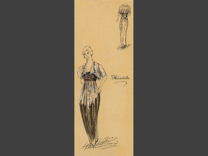 - Modeteckning tecknad på smörgåspappersliknande papper. En skiss av svart tusch och en teckning i färg av en kvinna klädd i en svart långklänning med brodyr på bröstet och med halvgenomskinlig bolero.
