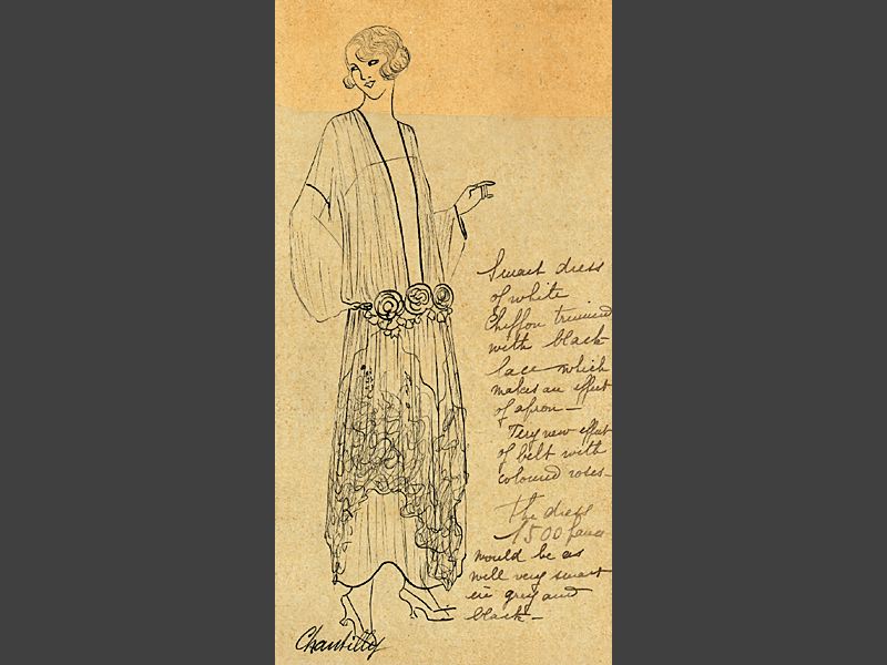 Smart dress of white chiffon trimmed with black lace wich makes an