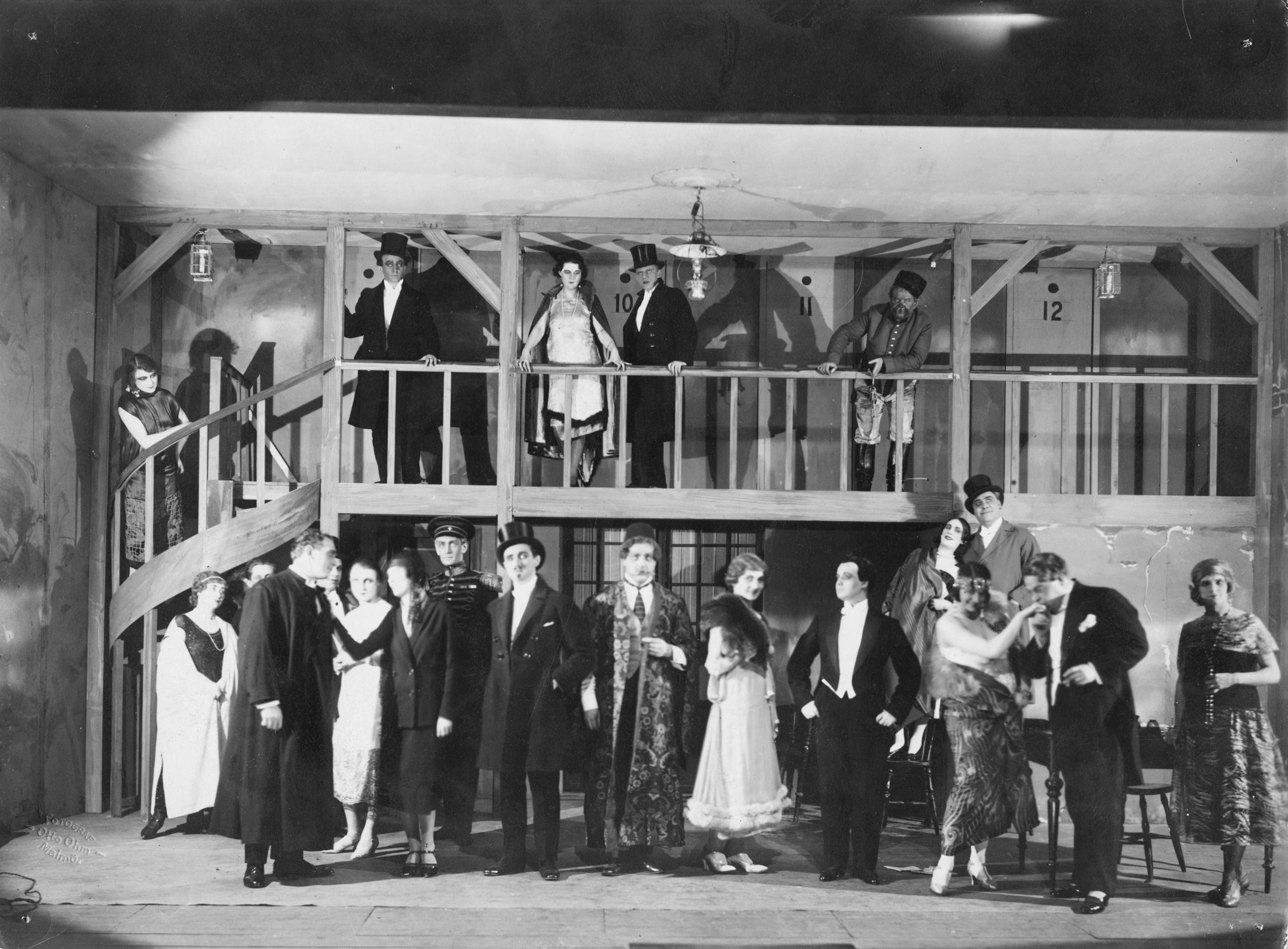 Grupp av skådespelare, bland andra Arvid Kindahl (på balongen längst t.h.), Maja Cassel (i trappan till balkongen), Jullan Kindahl (längst till vänster på golvet), Greta Ahlberg (som lägger armen på axeln på någon), Adolf Jahr (ungefär i mitten med brokadrocken och fez) och Edvard Persson (som kysser någon [möjligen Lola Grahl] på hand) i operetten "Läderlappen" på Hippodromteatern i Malmö. Föreställningen hade premiär den 21 april 1925.