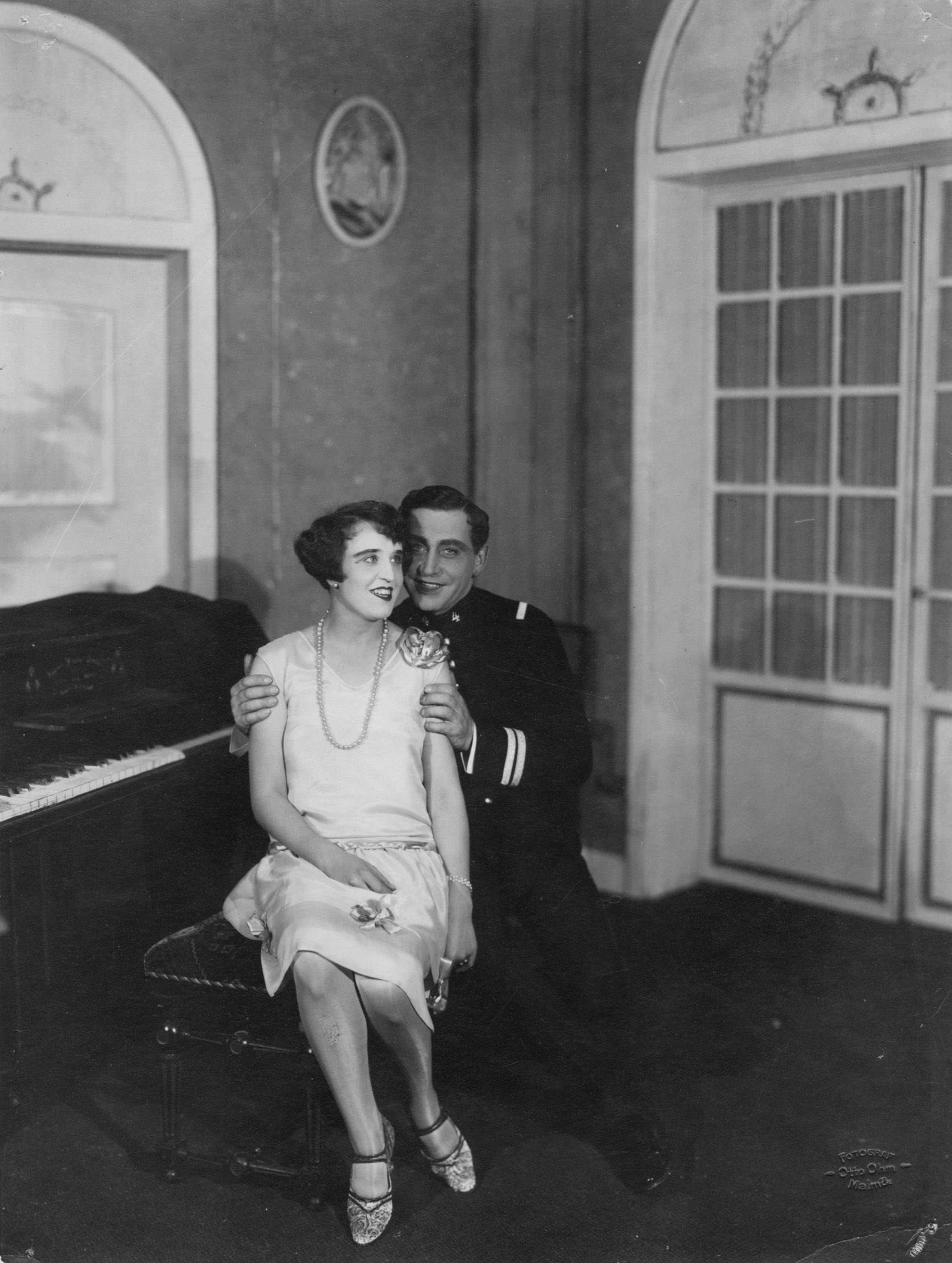 Greta Ahlberg och en oidentifierad man i första akten av operetten "Kyska Susanna" på Hippodromteatern i Malmö. Föreställningen hade premiär den 10 oktober 1925.