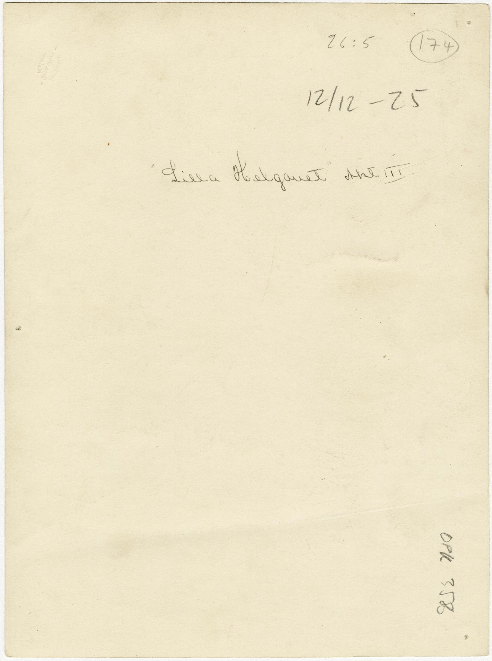 Påskriften lyder: ""Lilla Helgonet" Akt III". Uppe i högra hörnet står "26:5 174" (174 inom en cirkel).