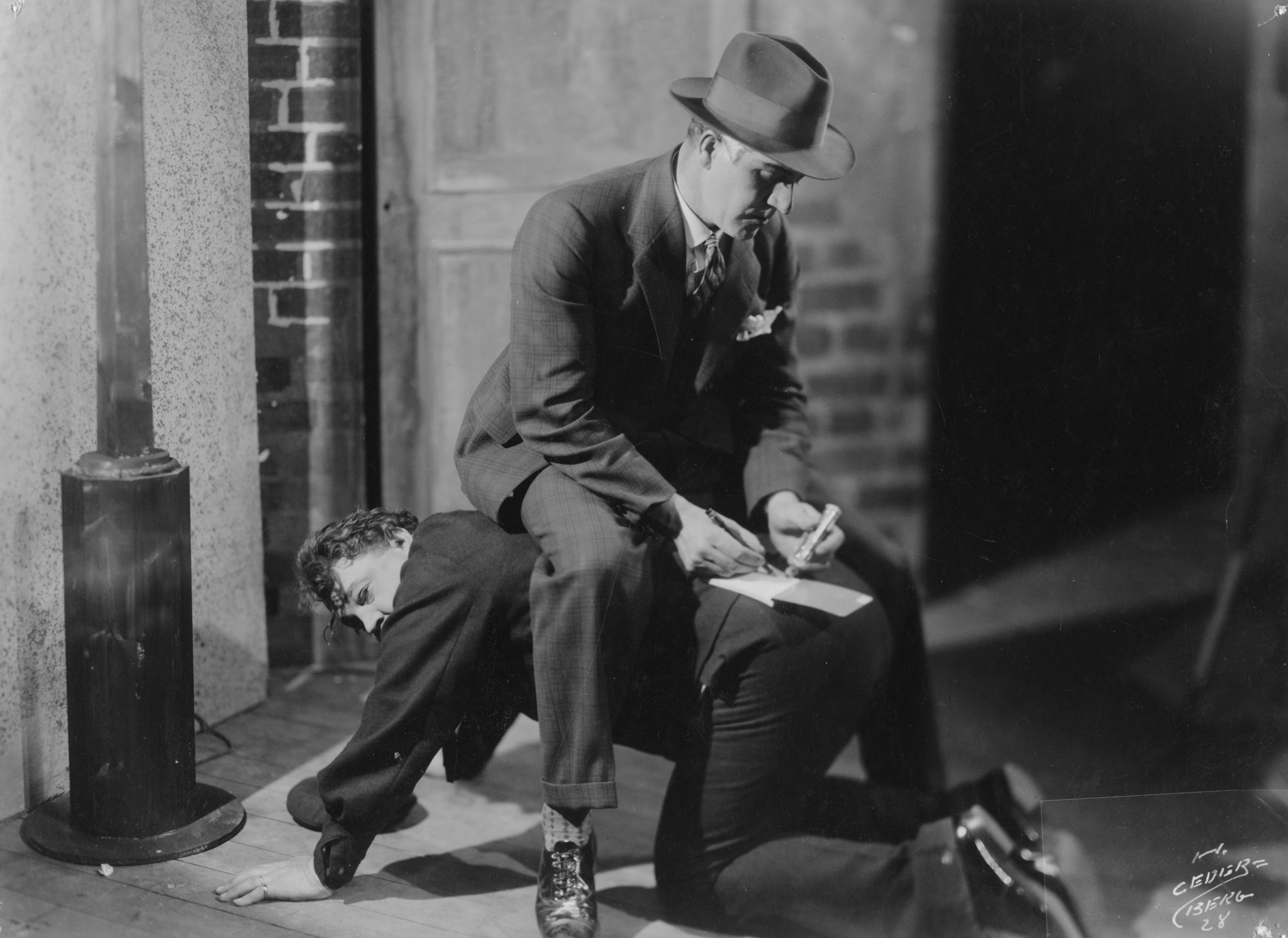 Adolf Jahr och Edvard Persson i kriminalkomedin "N:r 17" på Hippodromteatern i Malmö. Föreställningen hade premiär den 10 oktober 1928.
