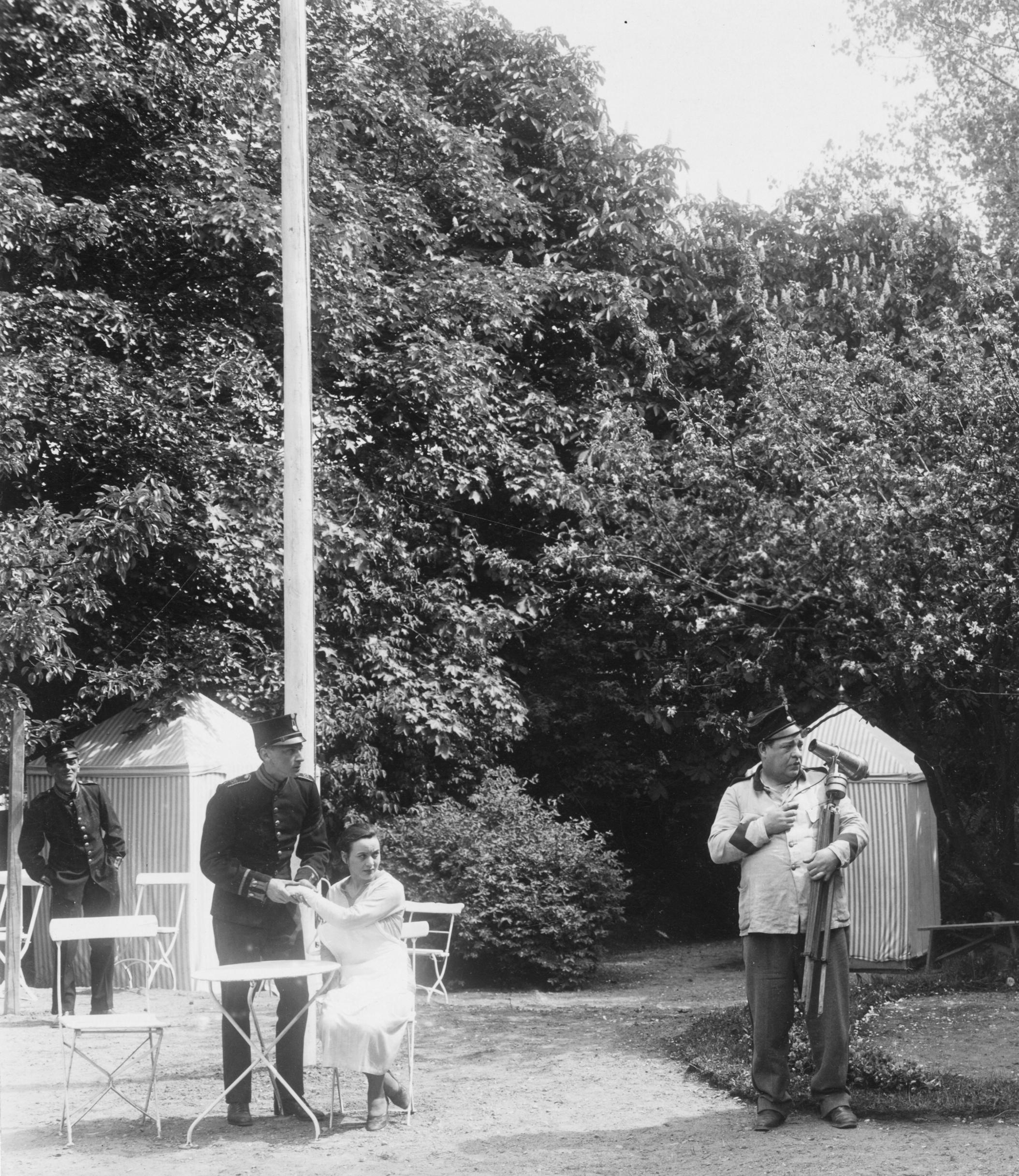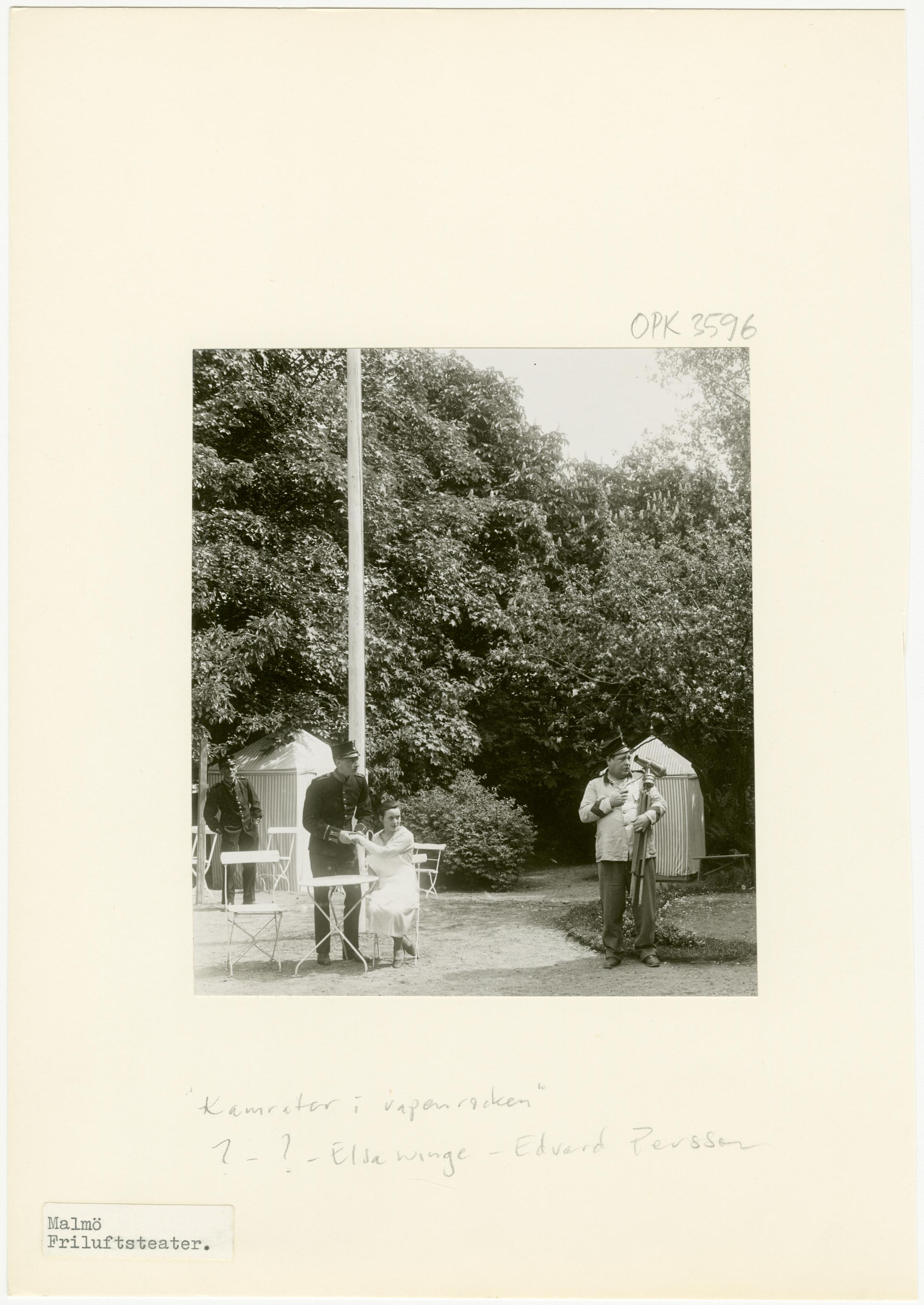 - Einar Bryhme (?), en oidentifierad man, Elsa Winge och Edvard Persson i lustspelet "Kamrat i vapenrocken" på Friluftsteatern i Malmö. Föreställningen hade premiär den 30 maj 1931.