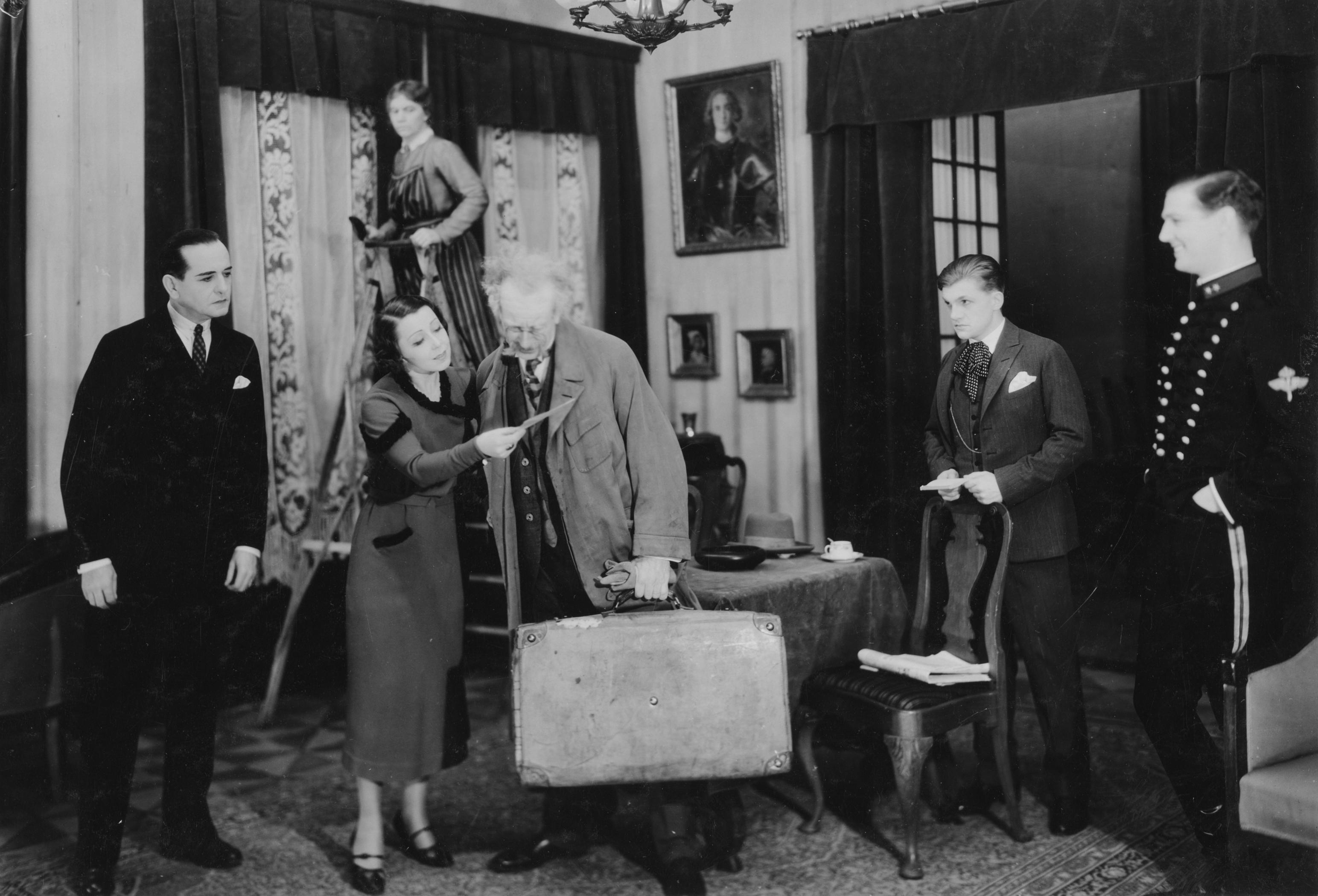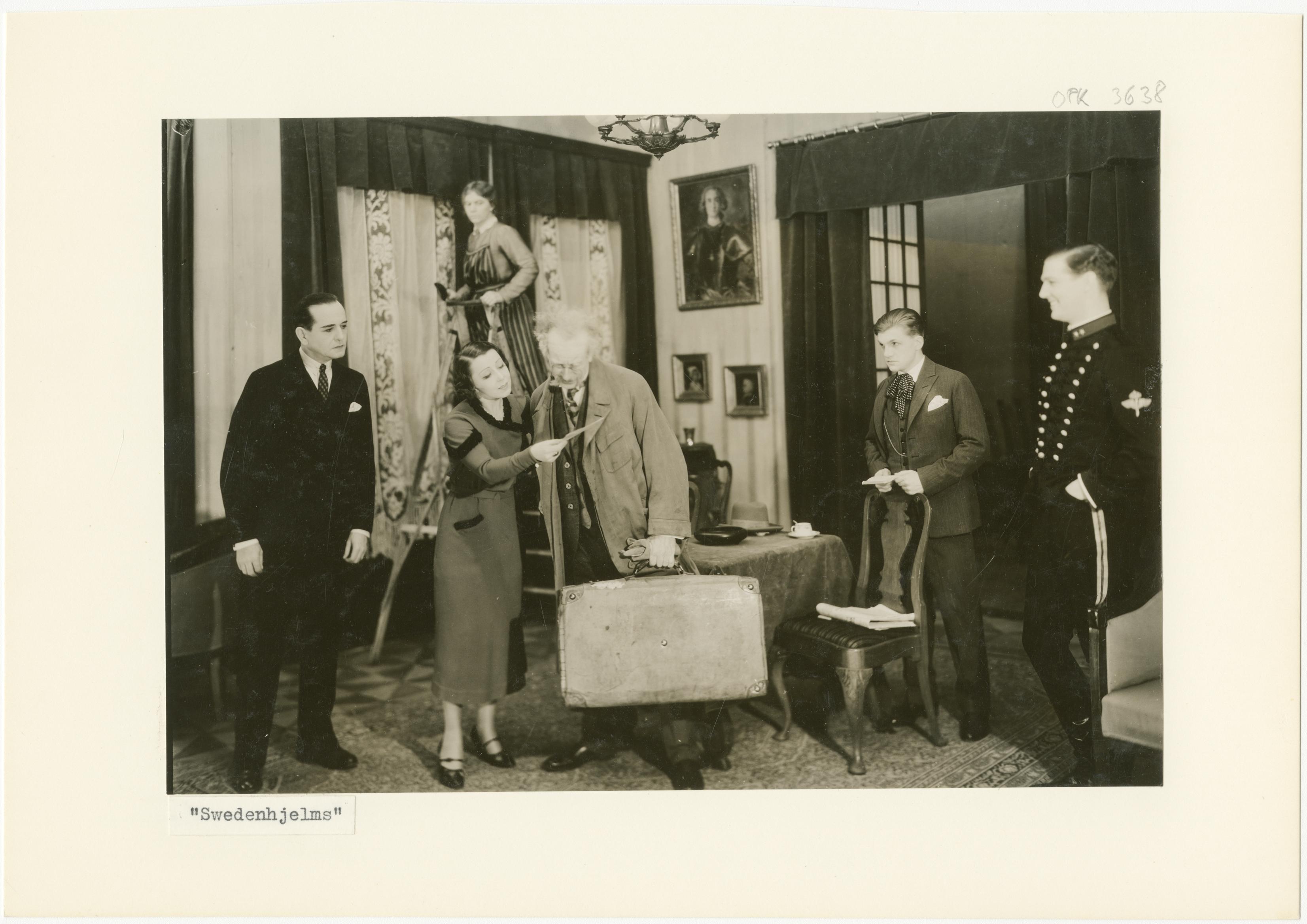 - Poul Reumert (med resväskan i mitten) och Åke Ohberg längst till höger, i Swedenhielms. Möjligen på Helsingborgs stadsteater. (Helsingborgs stadsteater gästspelade inte sällan på Malmö teater vid Gustav Adolfs torg). Kanske sent 1920-tal eller tidigt 1930-tal.