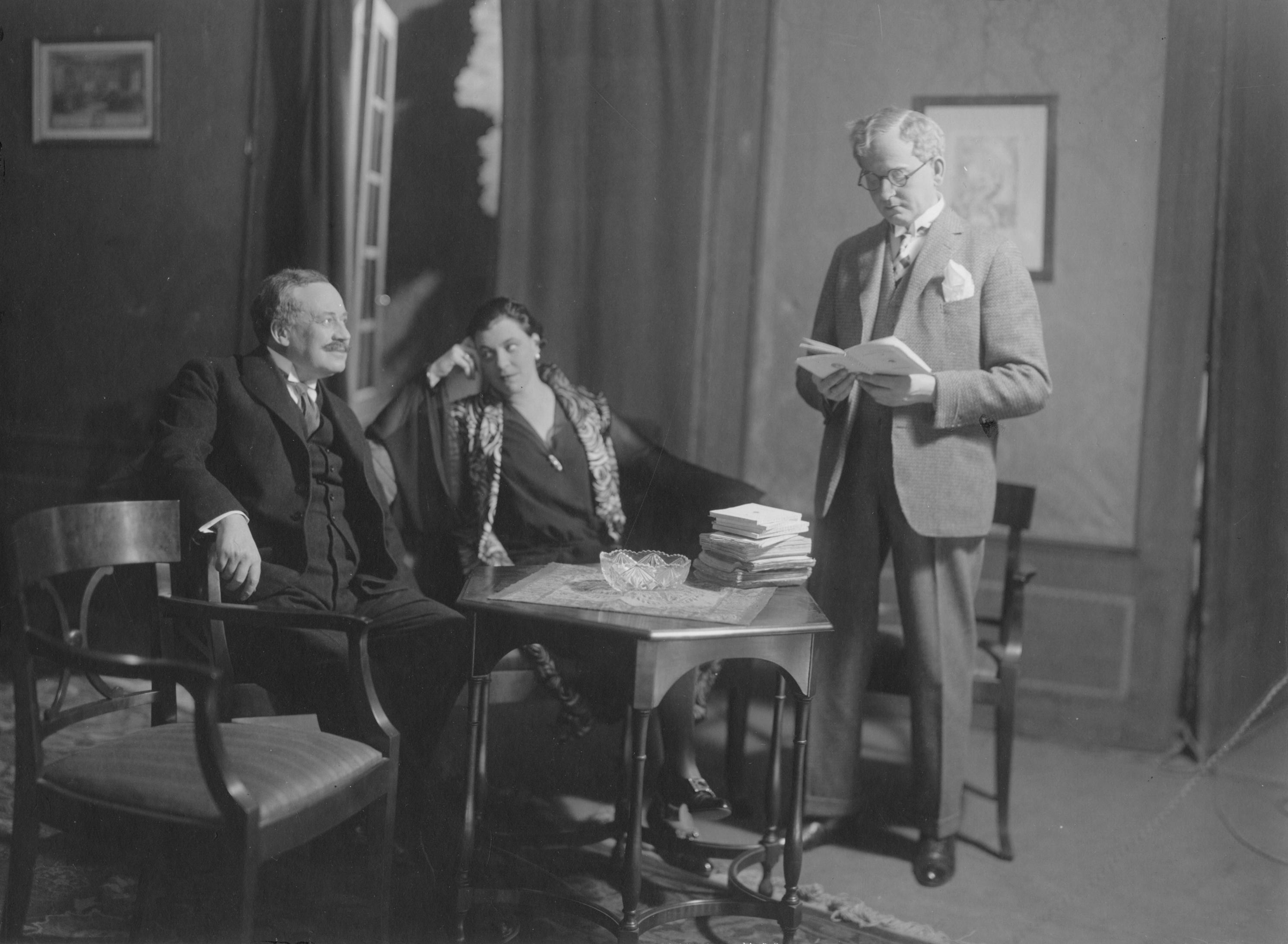 - Tre oidentifierade skådespelare. Frågan är om det är på Hippodromteatern eller på Helsingborgs stadsteater (eller möjligen på Malmö teater där Helsingborgs stadsteater inte sällan gästspelade). Möjligen sent 1920-tal eller tidigt 1930-tal.