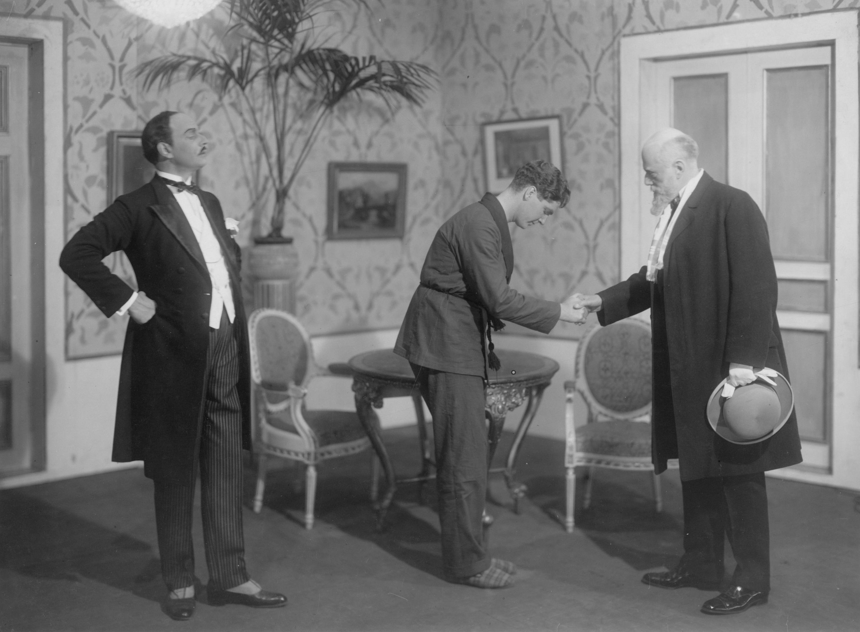 - Åke Ohberg (i mitten) och två oidentifierade skådespelare kanske på Helsingborgs stadsteater (eller möjligen på Malmö teater där Hbg:s stadsteater inte sällan gästspelade). Möjligen sent 1920-tal eller tidigt 1930-tal.