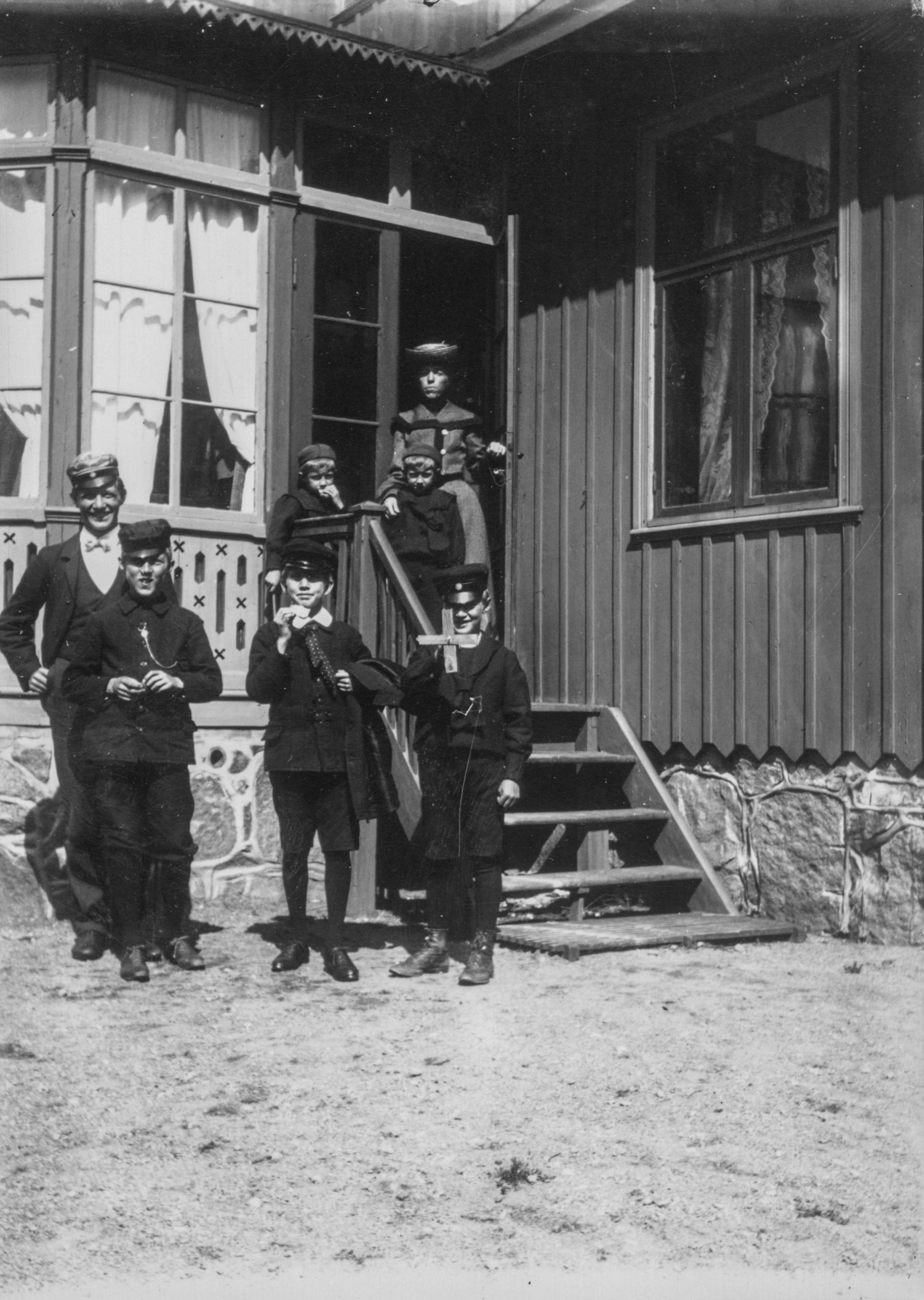 - En kvinna och sex barn, alla pojkar, en i ynglingaålder. Omkring år 1900. Kopior från glasnegativ tillhörande arkitekt Stenberg.