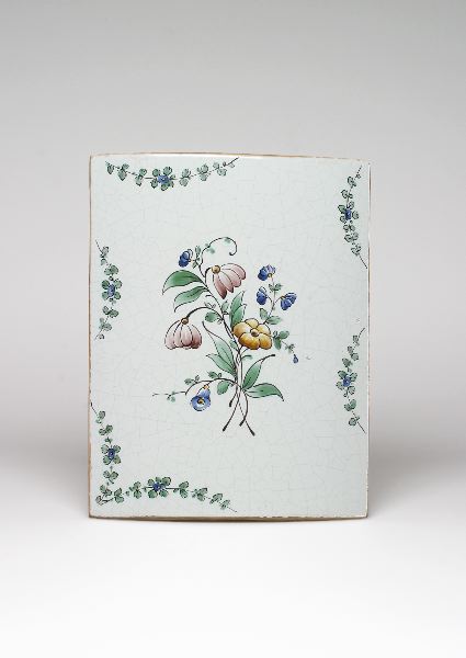 Kakel, glaserat, dekor av blommor i grönt, blått och gult.