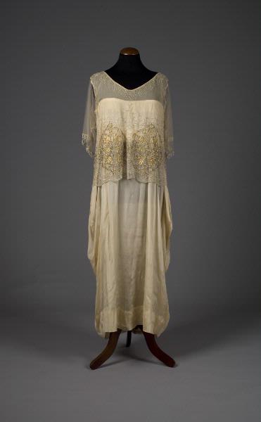 - Klänning av benvitt siden, crêpe de chine, chiffon samt vitt tyll broderad med pärlor i vitt och guld. Liv av tyll , hängande rakt fram, bak två sexkantiga stycken. Ringningen fram djup oval. Isydd rak ärm, halvlång kantad med pärlfrans.
