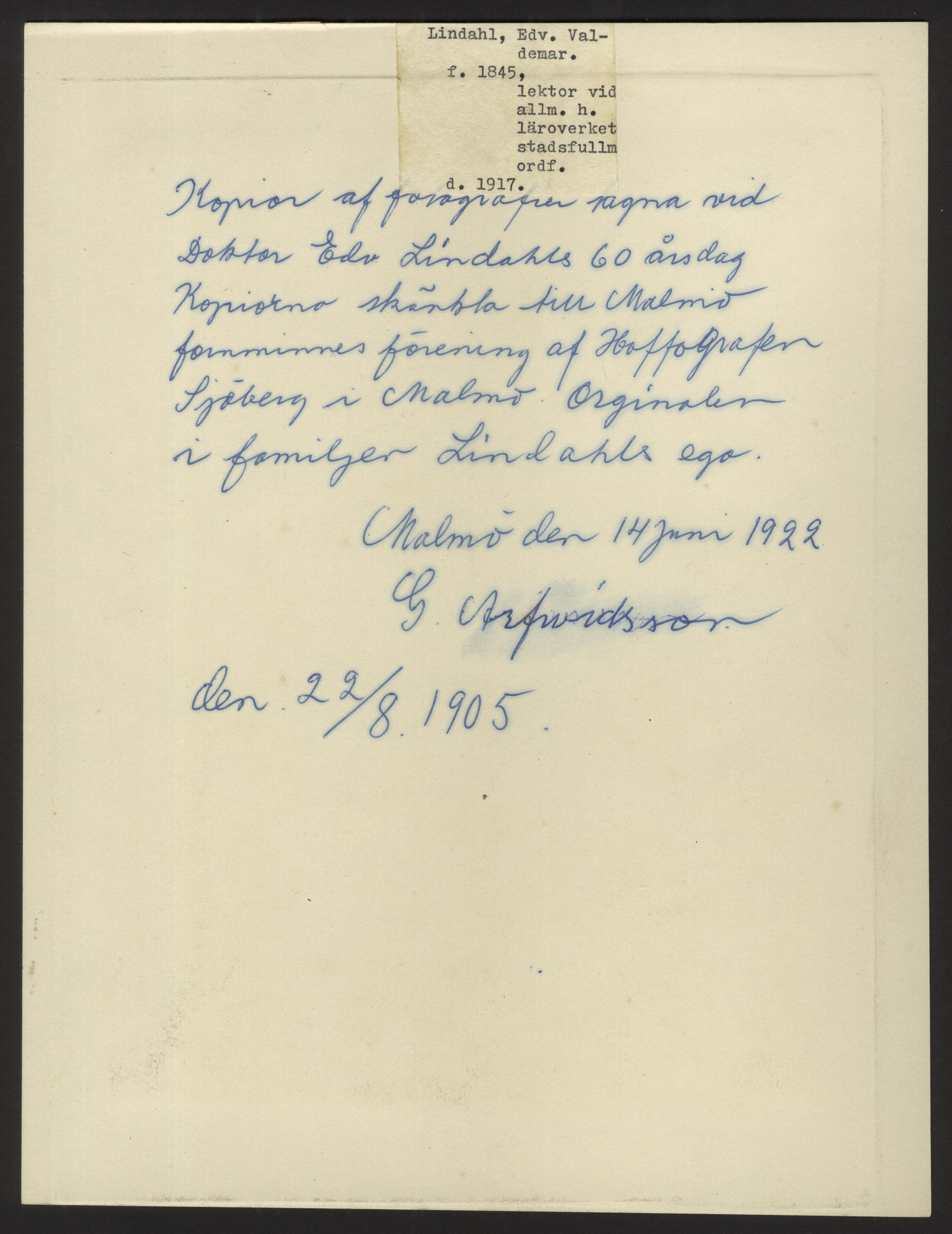 - Visitkortsfotografi. Porträtt av Edward Lindahl, lektor, bankdirektör och kommunalpolitiker. Frimurare, medlem i S:t Johanneslogen Acacian-Malmöhus. Gåva av konsulen (?) W. Engeström. Kopior av fotografier tagna vid Edward Lindahls 60-årsdag. Kopior skänkta till Malmö fornminnes förening av Hoffotografen Sjöberg i Malmö. Orginalen i familjen Lindahls ägo. Malmö den 14 juni 1922. G. Arfvidsson den 22 augusti 1905.