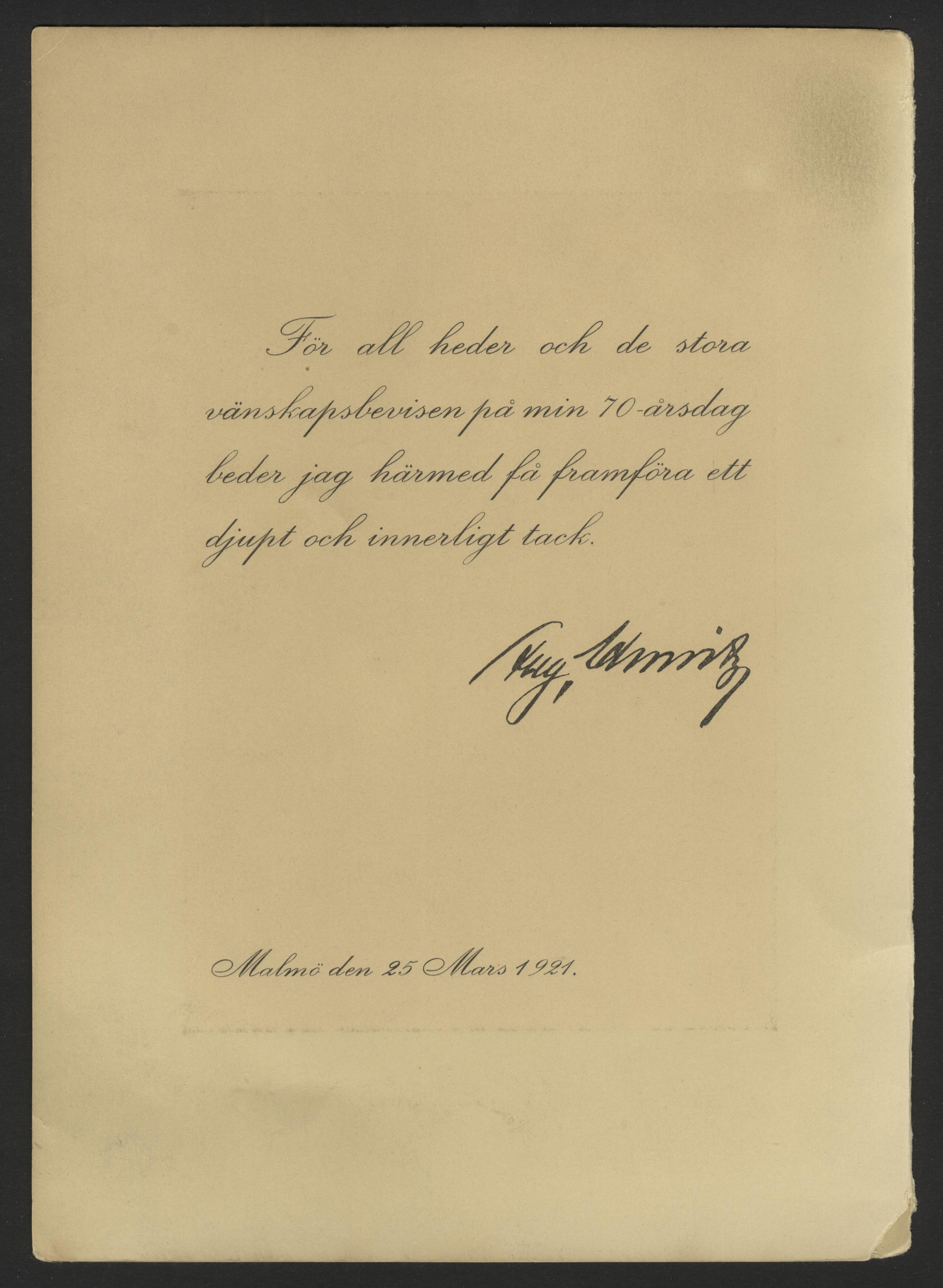 August Schmitz. För all heder och de stora vänskapsbevisen på min 70-årsdag beder jag härmed få framföra ett djupt och innerligt tack. Malmö den 25 Mars 1921.