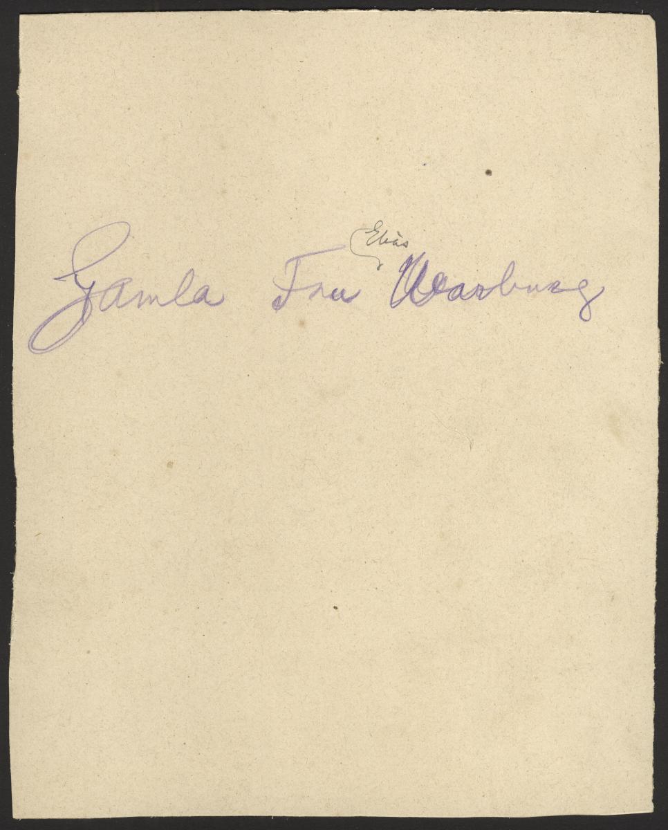 Visitkortsfotografi. Porträtt av Emma Warburg, född Glückstad. Felaktig uppgift handskriven på kortets baksida "Gamla Fru Elias Warburg".