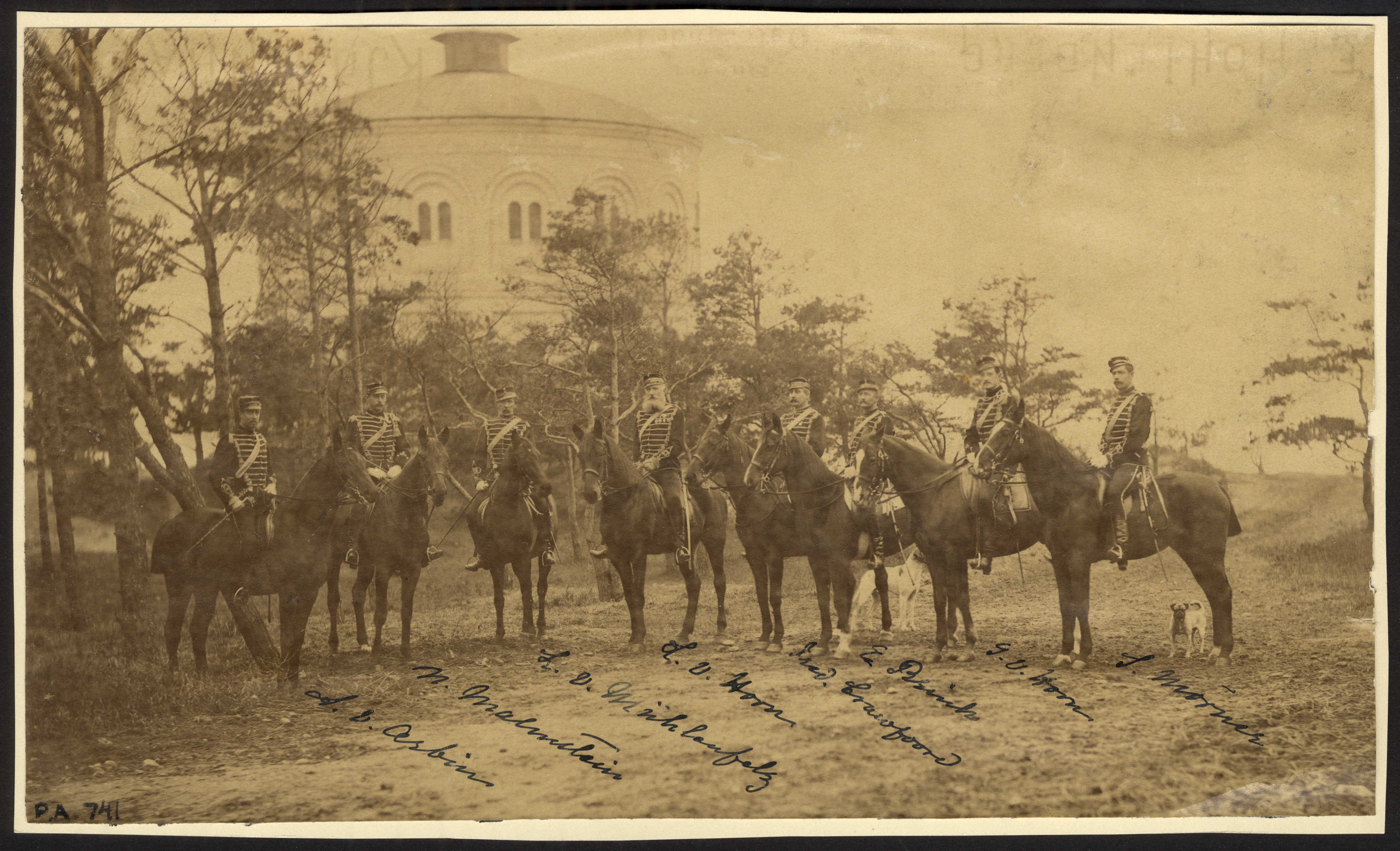 Visitkortsfotografi. Porträtt av officerare vid Kronprinsens Husarregemente. Arbin?, Malmstein?, svårläst namn, Horn, svårläst namn, Brinck och Mörner.