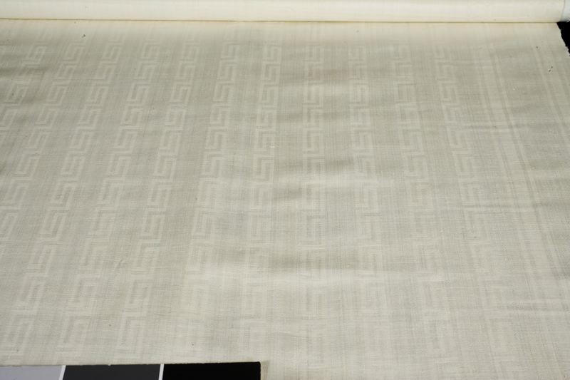 20 inslags och 20 varptr. på 1 cm. Bård med olika breda ränder som bildar rutor i hörnen. Spegel med meander ränder.