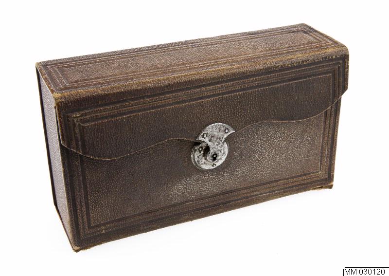 Resetui, trä, klätt med brunt skinn.