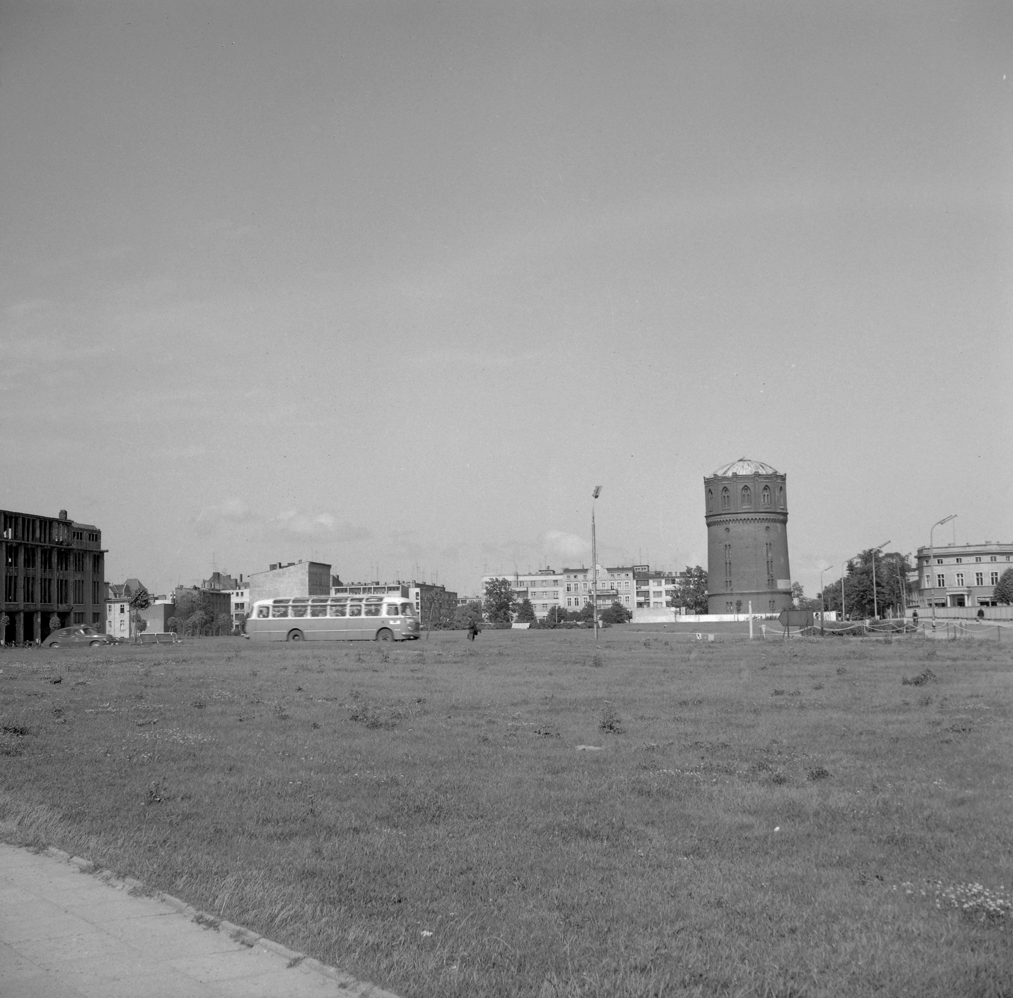 MM 063452:651 :: byggnader, buss, trottoar, byggnad, torn, bussar, gräs, träd