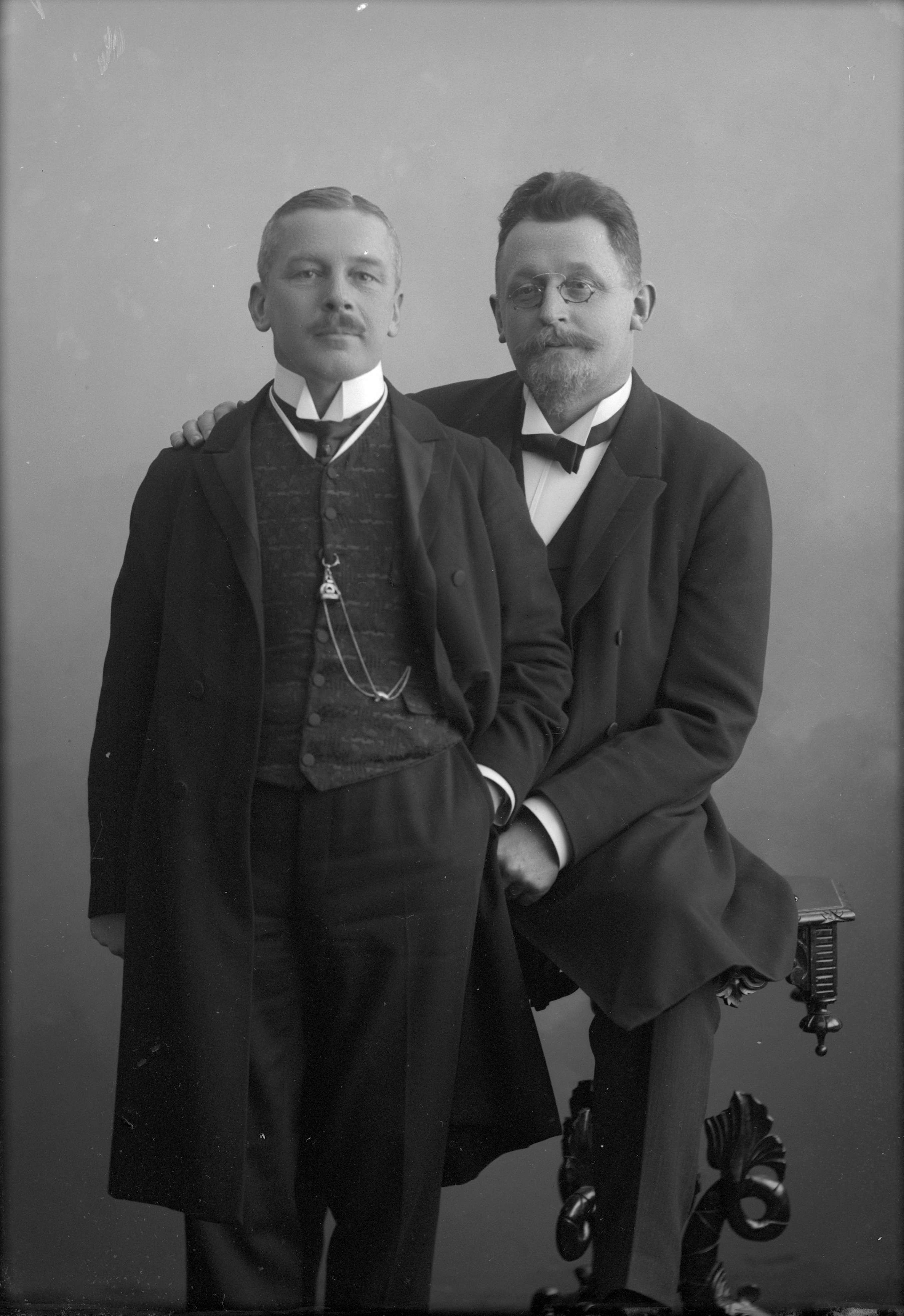 Porträtt i halvfigur av handelsmannen Petter Westergård och kronolänsman Magnus Köhler. Köhler halvsittande på bord.