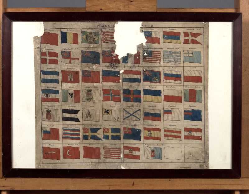 - Flaggkarta med olika nationers örlogs- och handelsflaggor inordnade i ett rutnät som fyller nästan hela arket. Nationsnamn och ev. typ av flagga finns angivet i varje ruta. Sammanlagt ca 50 flaggor avbildade.
