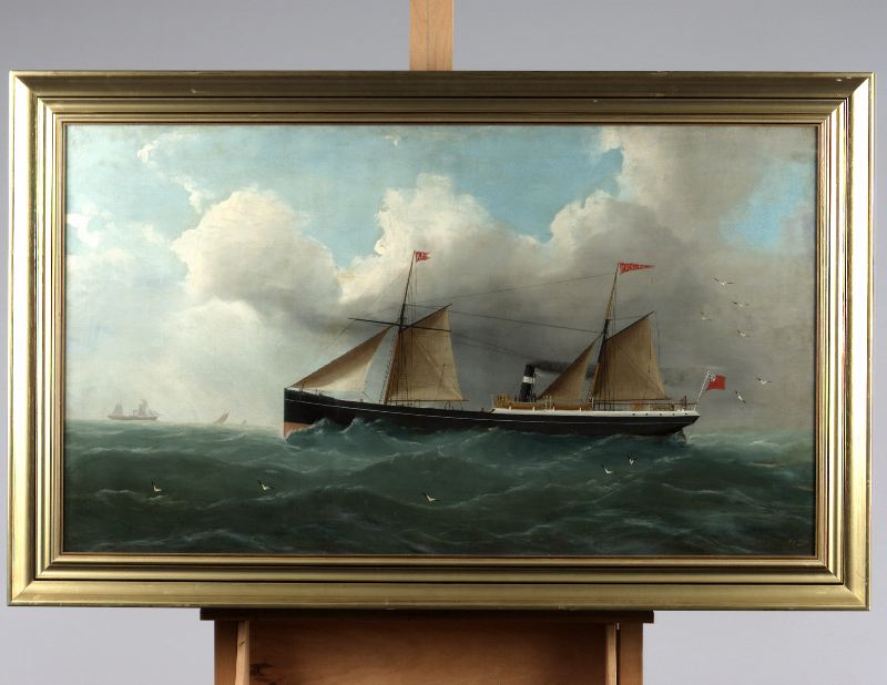 - Fartygsporträtt. ss P.Q. OSSIAN (på aktertopp), A.P. på röd botten på förtopp. Bokstäver vita, vita band på skorsten. England. Oljemålning. Konstnär W.D. Penny. Konserverad under 1980-talet av Henric Herec.