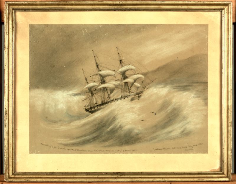 Teckningen visar ett segelfartyg i sjönöd. Storm och hög sjö ger ett dramatiskt intryck. Fartyget strandade vid Kaipara på Nya Zeelands västkust 3 juni 1851.