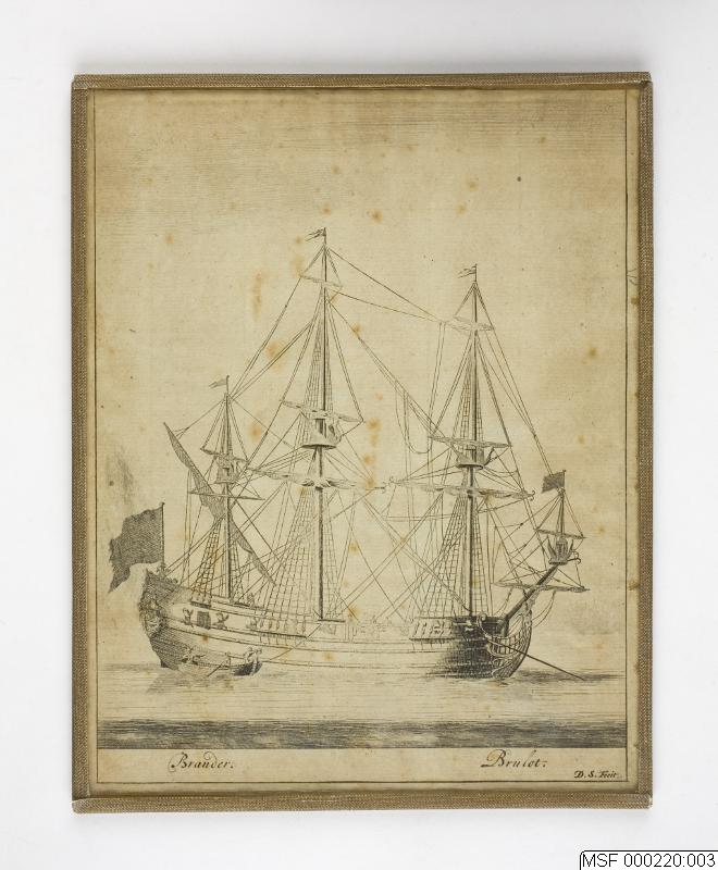 - Ett av sammanlagt 7 holländska koppartryck ur samma utgåva (förmodligen hämtade ur Nicolas Aubin: Dictionnaire de Marine, vars första utgåva trycktes i Amsterdam 1702 och därefter i flera andra utgåvor). Detta blad avbildar en "Brander", dvs. ett "brandskepp". Ett brandskepp eller en brännare, var på segelflottornas tid ett fartyg som var fyllt med brännbara ämnen vars ändamål var att sätta eld på fientliga skepp i samband med sjöslag.