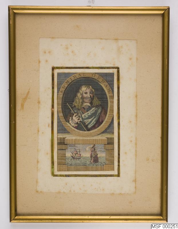 Tryck, förmodligen skuret ur äldre bokutgåva. Midjeporträtt av den holländske amiralen Opdam insatt i rund omramning, avbildad framifrån med en marskalkstav i handen framför sig. Infälld i en rektangulär omramning syns nedanför porträttet ett sceneri med två segelfartyg.