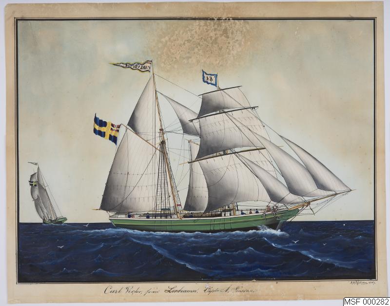 - Fartygsporträtt. Skonerten CARL VECTOR från Lerhamn från styrbords sida med Sveriges unionsflagga hissad. Text nertill: Carl Vector från Lerhamn, Captn A. Jönsson. Signerad L. P. Sjöström 1867. Akvarell och gouache, ram, glas.