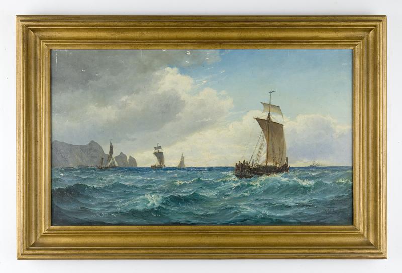 Marinmålning. Motiv: Några jakter utanför klippig kust, ångfartyg i bakgrunden. Oljemålning, ram. Svårläst konstnärssignatur. [1998-08-20 = Norges kust? Nordlandsbåtar?]