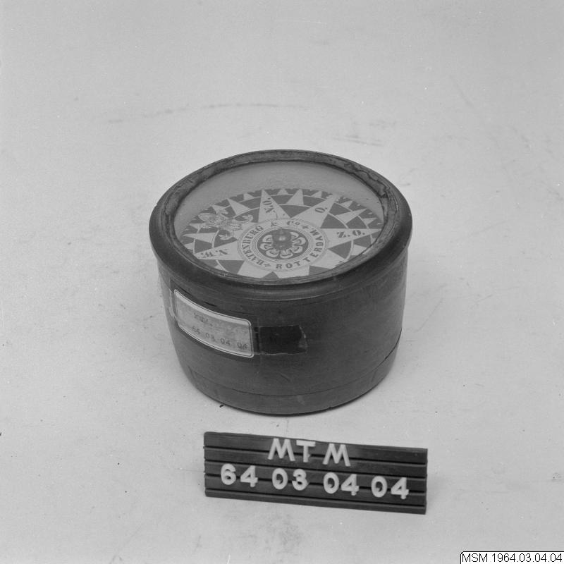 Marinkompass i träskål. Tillverkare: Batenburg & Co, Rotterdam.