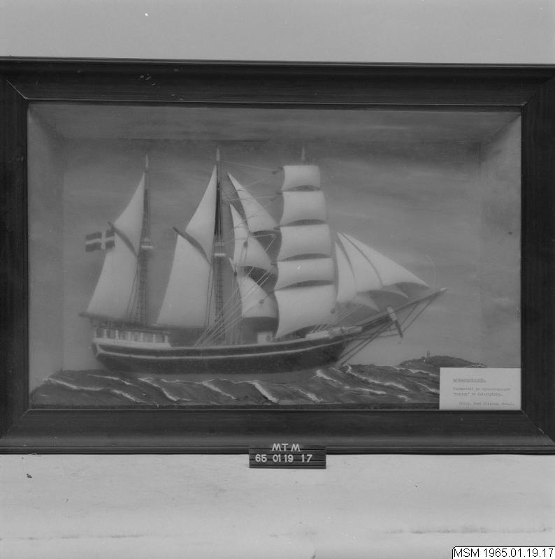 Halvmodell, skonertskeppet BONDEN från Helsingborg. Utförd av Joel Nilsson, Malmö.
