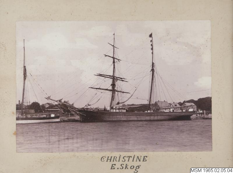 - Foto av barkskeppet CHRISTINE liggande förtöjd i en mindre hamn. Besättning syns ombord och ortsbefolkning på landbacken. Text på baksidan: "Christina Hon blef köpt / år 1902 Blef skänkt 1903.