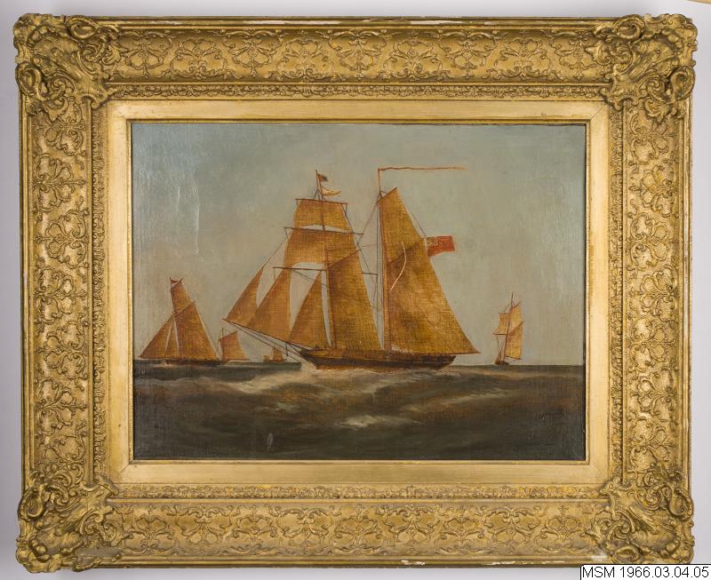 Fartygsporträtt, oljemålning på duk. Märssegelskonare förande engelsk flagg i övre hörnet på en stor röd flagga.