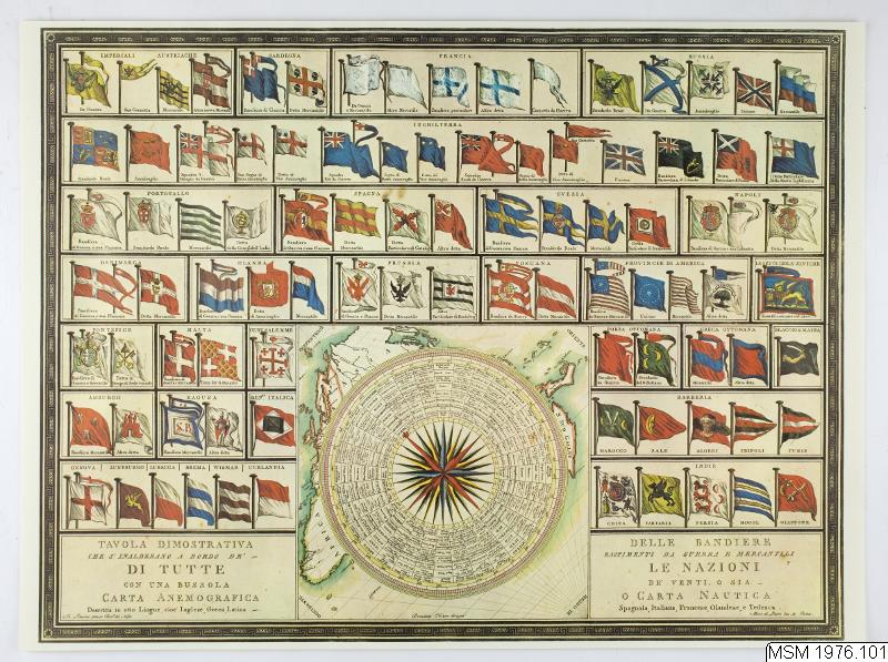 Flaggkarta kopparstick av Bellini, Nantes, år 1756. Nytryck, handkolorerat.