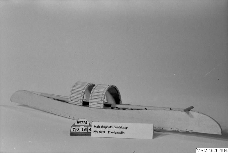 Fartygsmodell, helmodell. Hatscheputs puntskepp, Egypten, Nya Riket, 18:e dynastien. Två överbyggnader midskepps.