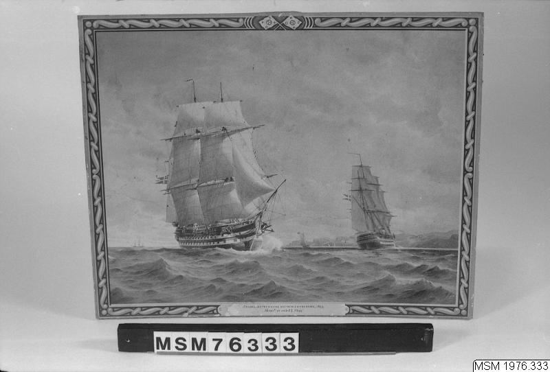 Färgreproduktion, motiv: svenskt och danskt örlogsfartyg. Efter Jacob Häggs akvarell 1853 Klistrat på masonit.