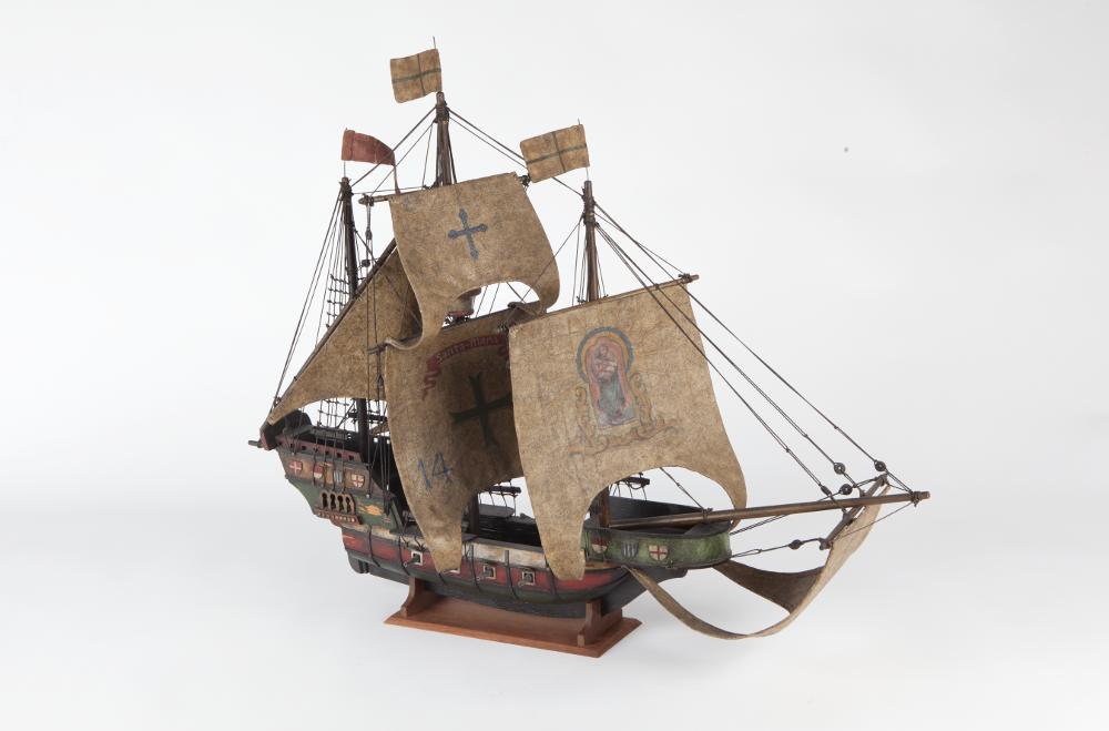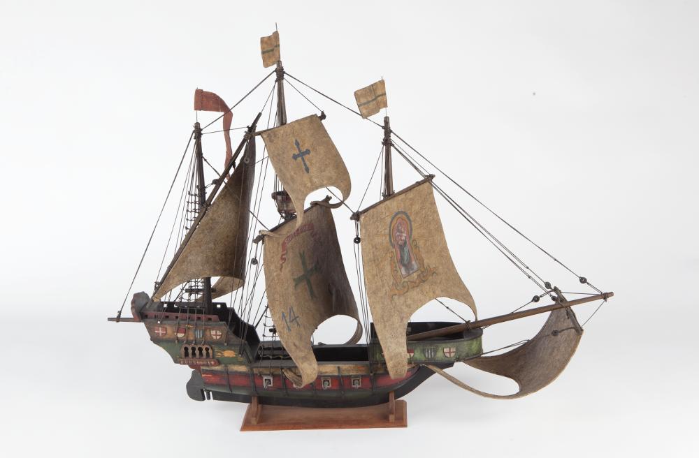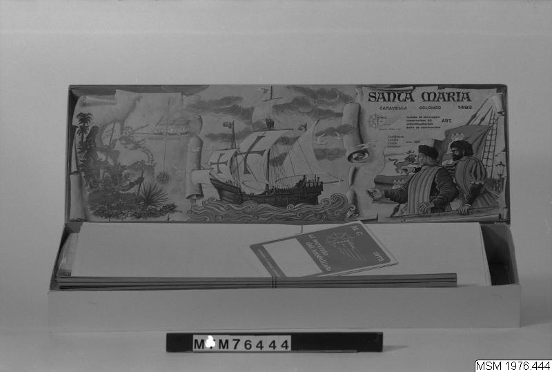 Byggsats/Skeppsmodell: Columbus "SANTA MARIA" år 1492. (ej färdigbyggd.). Skrovmått: längd, 540 mm. bredd, 140 mm. höjd, 175 mm. Tillverkare: Carta Augosto, Italien-Frali-Swiss.