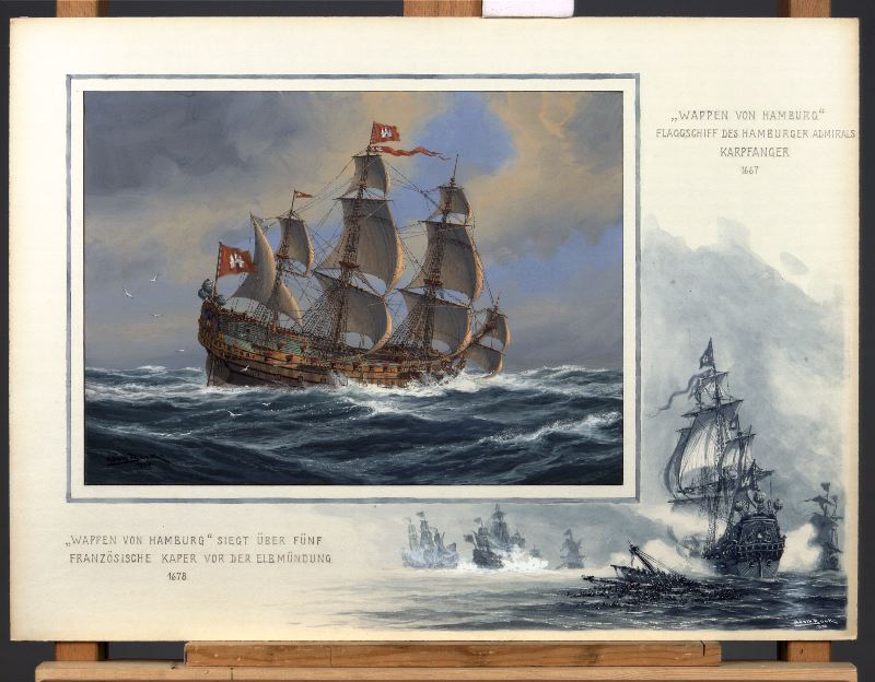 - Målning av det tyska krigsfartyget WAPPEN VON HAMBURG under seglats på öppet hav (målning), samt i ett gestaltat sjöslag vid Elbes mynning (lavering). Ingår i serien "Berömda segelfartyg" som en av sammanlagt 60 målningar (MSM 1980.038-097) gjorda för Allhems Förlag i avsikt att tryckas och utgivas som planscher i mapp.