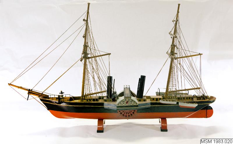 Fartygsmodell, hjulångare, modell av den typen som på 1850-60-talen upprätthöll post- trafiken Ystad-Stralsund. Sjömansarbete, klots, fernissad. Skrov: målad i rött, svart och gult. Briggriggad.