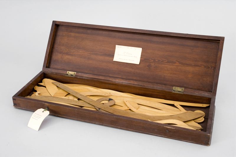 En brunbetsad trälåda innehållande olika kurvmallar för fartygskonstruktionsritningar, 44 olika linjaler. En del av mallarna är troligen tillverkade av päronträ. Mått enligt acc.kladden; 663x210x65 mm. Måtten avser lådan. Har tillhört P. Ekström (Lundquist) (visitkort på lådans lock).