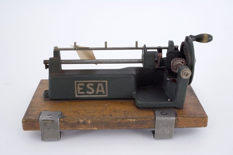 - Blyertsvässare för bordsmontering, tillv.: ESA. Grön frostlackering. Enl. bifogad information från 1920-talet. Monterad på träplatta. Uppsamlingskärlet saknas. Mått öa; 350x195x180 mm.