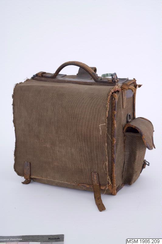 - Kameraväska innehållande en bälgkamera för negativformat 13x18. Märkt: Ph. Baumbach Nachf. Otto Brzoskà, Photohandlung, Darmstadt, Rheinstr. 19. Användes hos Kockums Mek. Verkstad. På objektivplattansa mässingring står; Gruppen Antiplanet 43 mm. Mått; 220x95x280 mm. Med vattenpass i bottenplattan. Löst tillbehör; 2 st. dubbelkassetter 175x25x235 mm, 1 st. objektivplatta 170x100x15 mm, 1 st. trasig ridåslutare 110x35x110 mm, 1 st. kort trådutlösare, 1 st. objektiv Steinheil in München nr. 26977 med olika bländare genom en rund skiva diam 75x40 mm, 1 st. objektiv Steinheil in München nr. 24572 patent för instickbländare diam 70x58 mm, 1 st. instickbländare, ett knippe med olika bländare från 5,4-36, läderfodralet är sönder 45x65x10 mm, 1 st. objektiv Emil Busch AG, Rathenow nr. 226572, typ Busch-Bis Telar Ser.II F:7 No. 3 F=400 mm diam 70x80 mm. Alltsammans i kameraväska av juteväv med läderbeslag. Väskan är sliten. Stativhuvud av mässing diam 100 x 50 mm..