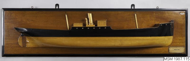 - Halvmodell, bgn 59 ss PLUTO. Bottenplatta av mahogny med svart kant. Skrov av ljus botten, svartlackerad ovan vattenlinjen. Överbyggnad av lind. Små skador utmed däckkanten och i den svarta lacken. Namnplåt och byggnr. av papp finns. Foto utan acc.nr. Placering HK 7, arkiv.