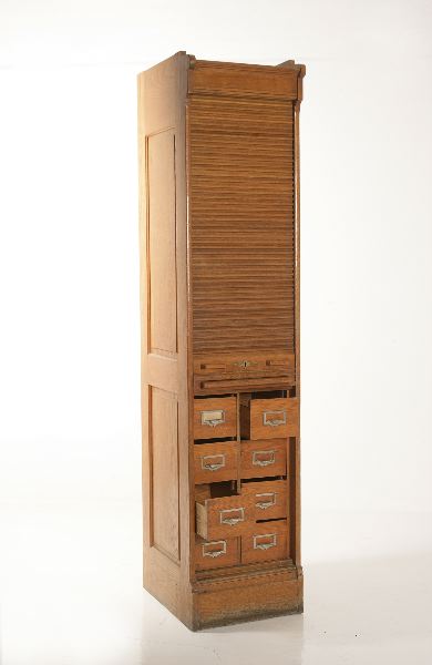 Blankettskåp av ek, övre delen är låst med jalusi, nyckel saknas. Nedre delen, 8 draglådor, dörr saknas. Från Kockum, "kontoret".