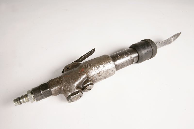 Tryckluftsdriven knarr nr 13. Atlas Copco 142-144. Mejsel (handverktyg) typ RRC 12 användes vid rensning av svetsfogar från slagg.