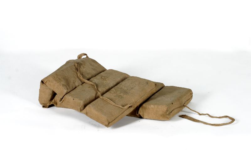 Räddningsväst av äldre typ. Maskinsydda fickor till korken, upptill sydd för hand med björntråd. 8 korksektioner.