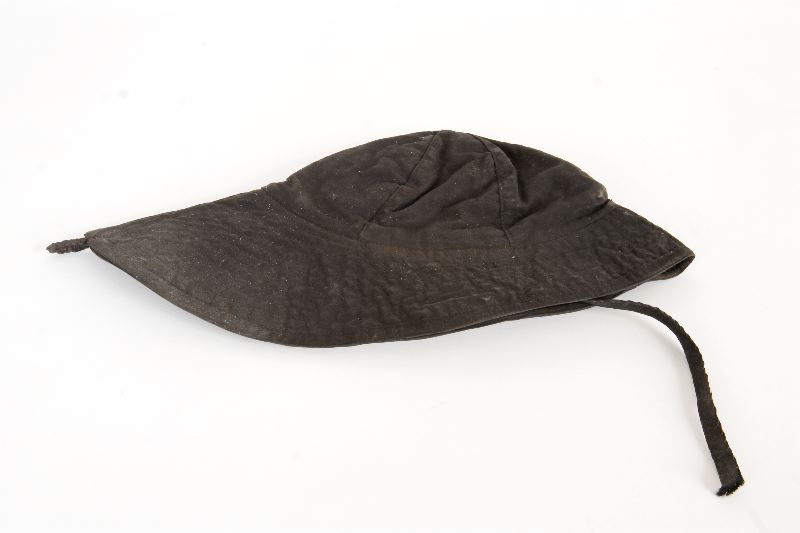 - Sydväst tillverkad av tjärad segelduk. Kulle och öronlappar är av ylle, upphängnings ögla i knutet tjärat bomullsgarn. Hakbandet är ett platt bomullssnöre, ett snöre saknas. Svart. Från vinden på Malmöhus I, märkt (0046).