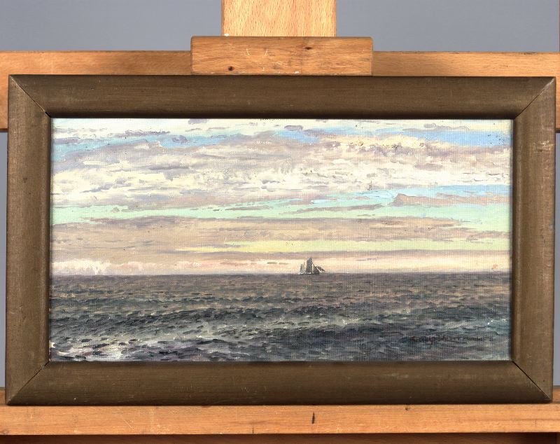 Målningen är en vy över öppet hav med ett segelfartyg synligt på stort avstånd vid horisonten.